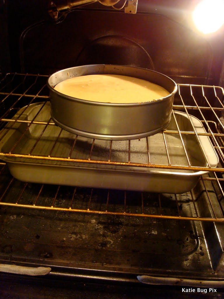 Glad we are all clear on that. Next important note on cheesecake baking (OK I didn't realize there were so many) water bath. Cheesecakes need water baths. They crave the extra moisture while baking. They just do. I didn't have any aluminum foil so I filled a large roasting pan halfway and put it just under the cheesecake in the oven. Perfect!